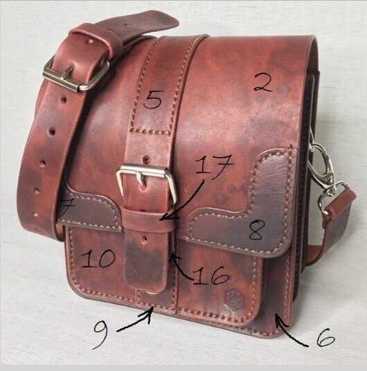 Решил я сшить себе сумку из кожи, как и собирался. Хорошо, в интернете полно выкроек, ибо сам я кроить не умею, выбрал себе вот такую: Так, ну скачиваю выкройки в pdf, распечатываю и вырезаю на обычной бумаге, где надо склеиваю детали между собой: Дальше приклеил с помощью бумажного скотча выкройки к коже с обратной стороны и аккуратно, канцелярским ножом вырезаю уже детали сумки из кожи. Нужно сказать, что кожа была рыжая, вот такая: Это мне не сильно нравилось, решил ее покрасить в коричневый. Краска легла не ровно, пятнами, но я решил превратить этот баг в фичу. Взял губку и с ее помощью хаотично нанес краску пятнами по всей поверхности, результат показался мне вполне приемлемым. Детали вырезаны и готовы к сборке. Отверстия на всех деталях пробил заранее, риск несовпадения отверстий конечно есть, но попробую сделать аккуратно: Начал сборку с простого, на крышку сумки пришиваю декоративные уголки. Клей использовал SAR-306, его нужно нанести, подождать и перед самим склеиванием хорошо
