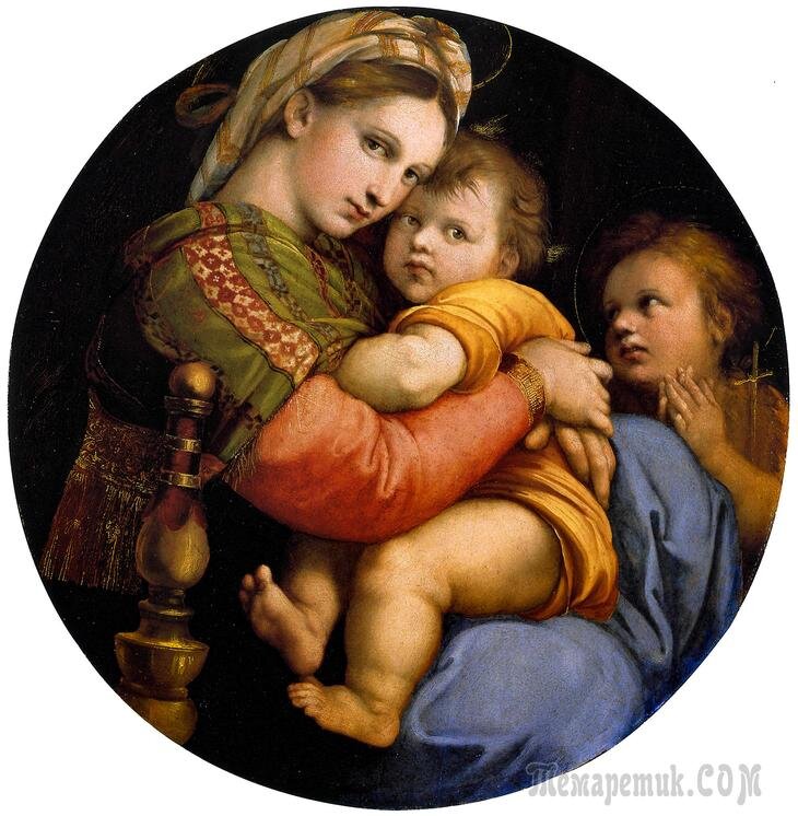 Примечание - Необычная для Рафаэля работа: композиция какая-то не собранная (в пирамиду), одноплановая... Обычно Рафаэль прописывает руки символически, а тут очень натурально.