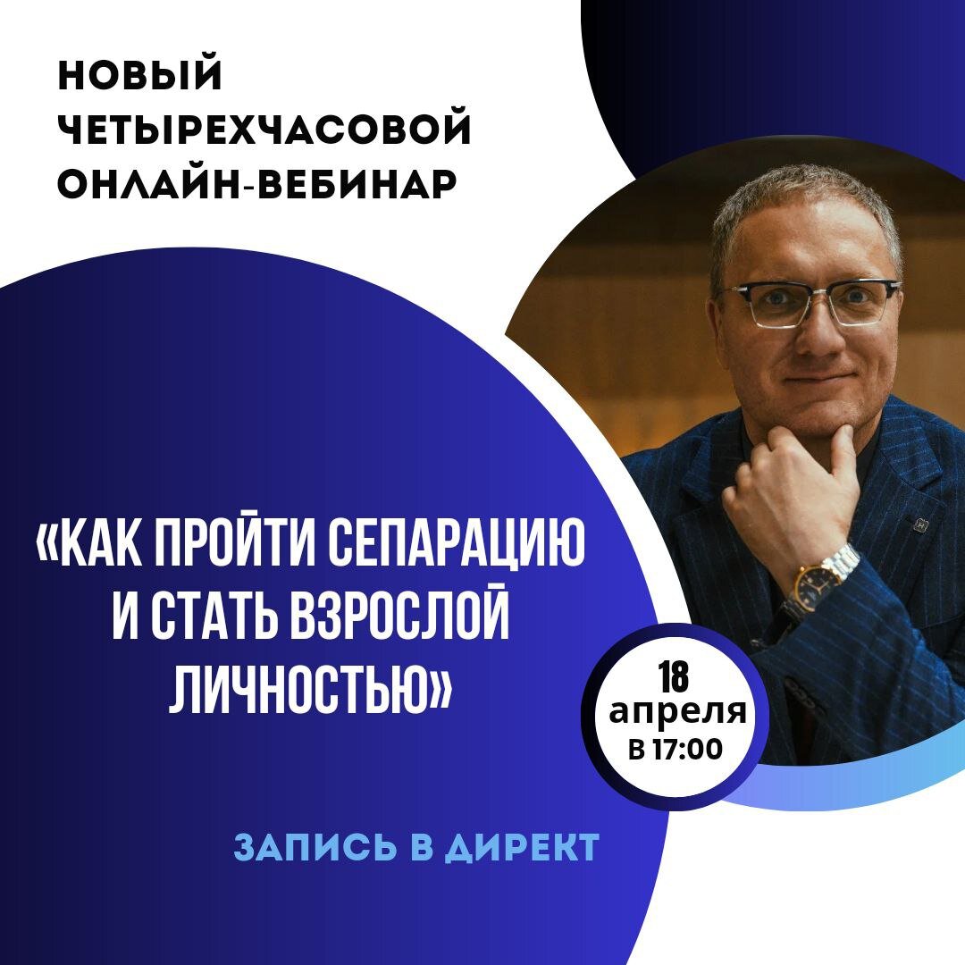 Новый четырехчасовой вебинар, очень важная тема. Без этих знаний никакого личностного роста и взросления невозможно: «Как пройти сепарацию и стать взрослой личностью». На вебинаре подробно разберем, что такое сепарация, как её пройти, как это сделать гармонично, не разрушая себя и отношения с другими людьми. Сепарация – это приобретение своей собственной силы, автономности, своего собственного «я», потенциала, полноценной жизни, радости и счастья! Сепарация – это приобретение своих ценностей, интересов, целей, ориентиров в жизни. Сепарация – это возвращение себе полноценной жизни и своих многих подавленных частей личности, своих «я». Только пройдя сепарацию, вы сможете создавать по-настоящему близкие отношения, любить и переживать настоящий контакт с любимым человеком. Вы приобретете свои собственные чувства. И вы удивитесь, что никогда ранее своими чувствами не жили. Все чувства в вас были чужими, и поэтому вам было плохо, неприятно, некомфортно, не хотелось быть собой. Потому что это