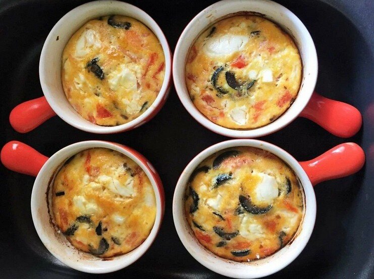 Экспромт нам всем понравился и закрепился в нашем меню. Я люблю порционную подачу, но такую яичницу можно приготовить в форме для запекания или приготовить в сковороде, а потом поделить на порции. Такой вариант отлично подходит для завтрака в выходной день, когда никуда не торопишься и можешь позволить себе посмаковать вкусный, полезный, сбалансированный завтрак. Первым делом надо включить духовку, пока она прогревается, все для яичницы будет готово. Что ещё приготовить из яиц можно посмотреть в подборке рецептов, переходите по ссылке Приготовление Помидор, сладкий перец - нарезаю мелким кубиком. Оливы разрезаю пополам и отделяю от косточки (я люблю именно такие оливки, можно использовать оливки без косточек). У меня крупные оливки, зрелые, легко отделяются от косточки, .