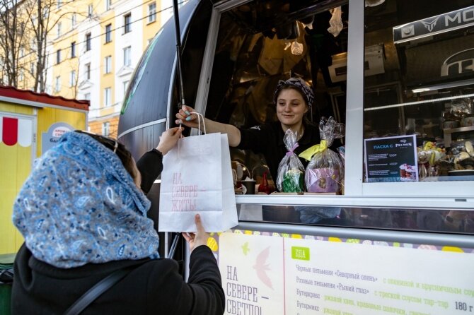 Сегодня в Мурманске открылась очередная ярмарка на улице Воровского. В этот раз - пасхальная. Подозреваю, что из-за установки трибун в начале улицы, вход на ярмарку никак не оформлен, да и вообще красные металические остовы смотрятся не к месту, поэтому общее впечатление автоматически смазывается. Нет и привычных тематических растяжек над территорией ярмарки, поэтому пространство в целом выглядит сиротливо. 17 торговых точек - домиков и фудтраков все-же оформлены по-пасхальному, но это их не спасает. Кроме привычных сувенирных, есть несколько новых игроков и это здорово. Значит есть интерес, и хорошая инициатива не угаснет. Потому как нельзя отрицать, что инициатива с ярмарками в целом - задумка крутая, особенно когда и оформление, и наполнение соответствует событию. Однако с тематическими названиями блюд в этот раз никто не запаривался. Единственное, что бросилось мне в глаза - это капучино «Пасхальный кролик» с милым кроликом из маршмеллоу. Чтобы хоть как-то отвечать цели ярмарки, пр