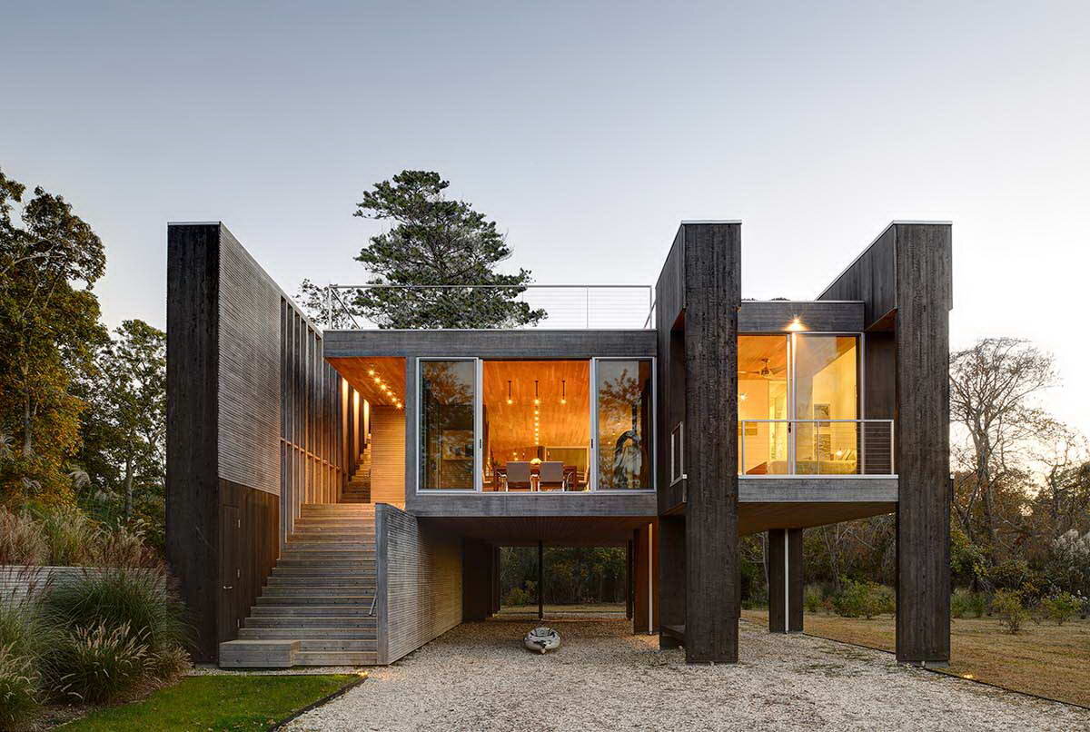 США является лидером и законодателем моды в частной архитектуре, к тому же Америка - это "страна-субурбия" и поэтому естественно, что больше всего красивых и необычных домов построено и строится именно там. В нашей коллекции домов из США тоже больше всего - их количество перевалило за 1000. Мы будем продолжать знакомить читателей канала с лучшим из лучшего. 1. Загородный дом на берегу в США В связи с опасностью наводнения местный регламент требует приподнимать дома выше уровня возможного подъёма воды. В данном случае жилые помещения находятся на высоте более трёх метров, а роскошная деревянная лестница поднимается дальше, на плоскую эксплуатируемую крышу, где кроме деревянной террасы устроен зелёный газон. Пространство под домом используется в качестве автостоянки... 👇 2. Загородный дом в США 50 Дом расположен на вершине небольшого холма в живописном лесном окружении. Частично он выдвинут вперёд, к склону и как бы зависает над верхушками расположенных ниже деревьев. У него большие ок