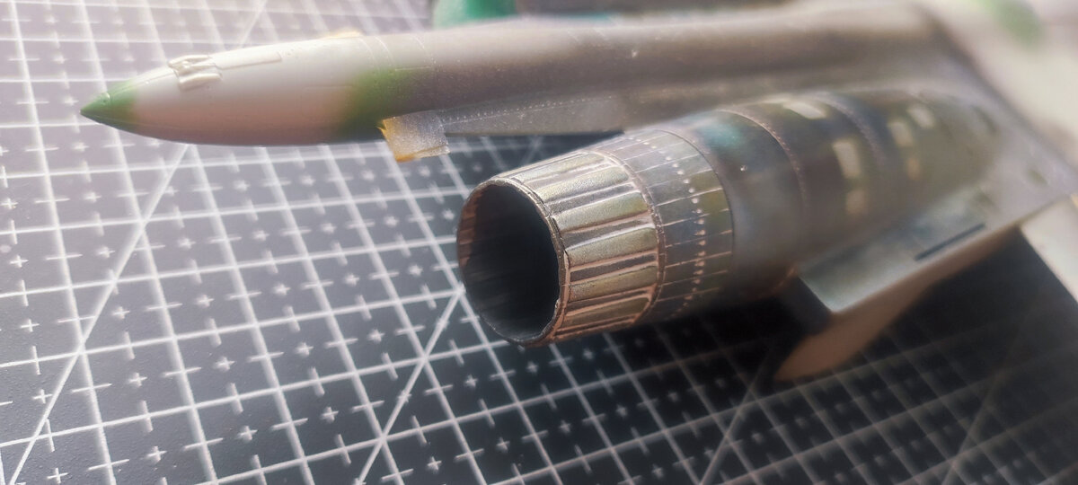 Самое интересный процесс оставил на последок при написании данной статьи. Начну покраску сопел и мотогондол( если правильно назвал). Прогрунтовав в черный цвет сверху нанес два слоя футуры, далее задул металликом от ZIP алюминий. Использовал маски от армы для лючков закрыл все светлые части. Далее целая наука и постоянное промывка аэрографа. Расшивку и швы выделил Тамией цвет(лак) смок. Разбавив лаковую серию LP цвет оранжевый в соотношении 70% разбавитель и 30% лака, прошелся точечно аэром как на соплах так и на гондолах. Затем последовал синий лак от ZIP здесь он шел без разбавления и более линейно выделяя более четкие контуры. Смешав красный и синий лак получил фиолетовый он был использован практически в прозрачном слое. И опять оранжевый серия LP разбавленный 50 на 50 и добавил чуть коричневого. После полного высыхания прошелся серой проливкой, высветлив некоторые места. В окончании зафиксировал полуматовым лаком. В дальнейшем работа будет еще проводиться над соплами , когда буду работать с масляными точками на всей модели.