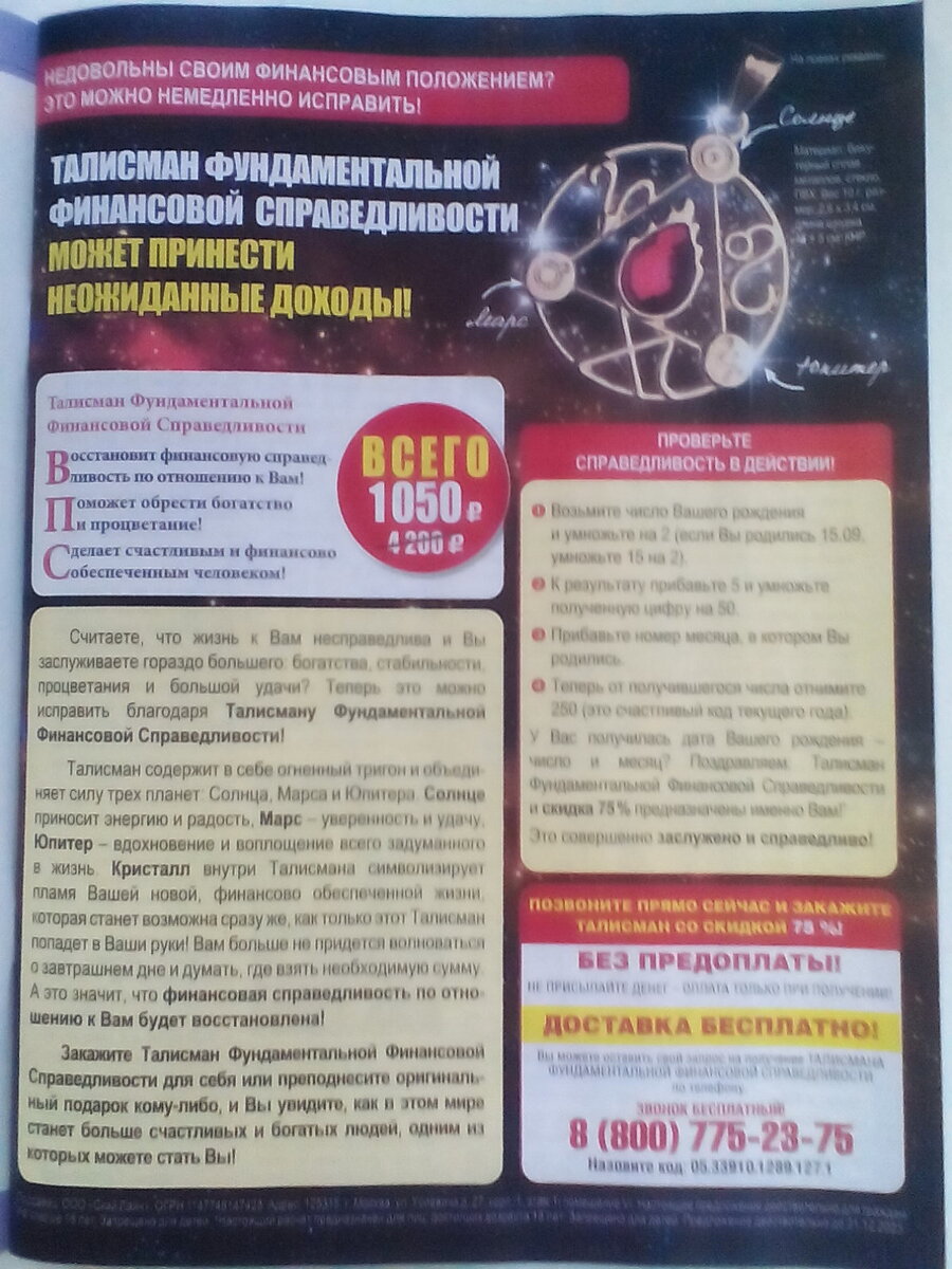 Приветствую вас, уважаемые читатели! Нынче тема моих публикаций будет посвящена разбору обещанного богатства, ясновидящими и предсказателями, путём различных вычислений. Ожидается несколько статей, поэтому советую подписаться всем, ещё не подписавшимся на мой канал, дабы не пропустить выход очередной статьи. ТАЛИСМАН ФУНДАМЕНТАЛЬНОЙ ФИНАНСОВОЙ СПРАВЕДЛИВОСТИ. Некто предлагает приобрести талисман, который восстановит финансовую справедливость, поможет обрести богатство и процветание, сделает счастливым и финансово обеспеченным человеком. Купить его можно со скидкой 75%, его стоимость вместо 4200 рублей, составит всего лишь 1050 рублей. Но такая возможность доступна не каждому, а только тем, у кого при определённых расчётах получится нужный результат. А вот и формула удачи: возьмите число вашего дня рождения и умножьте на 2, к результату прибавьте 5 и умножьте полученную цифру на 50, прибавьте номер месяца, в котором вы родились и от получившегося числа отнимите 250. У вас получилась да