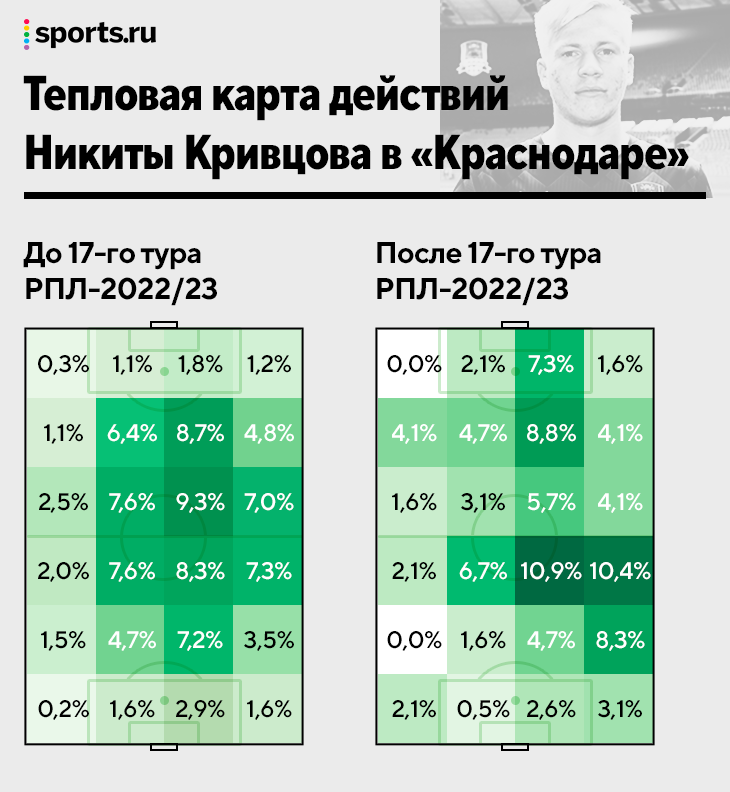 Уже в сентябре 2021-го Никита Кривцов дебютировал за основу «Краснодара», а в апреле 2022-го забил первый гол (всего в том сезоне было два). А в этом – уже шесть только в чемпионате: пять из них – весной 2023-го.