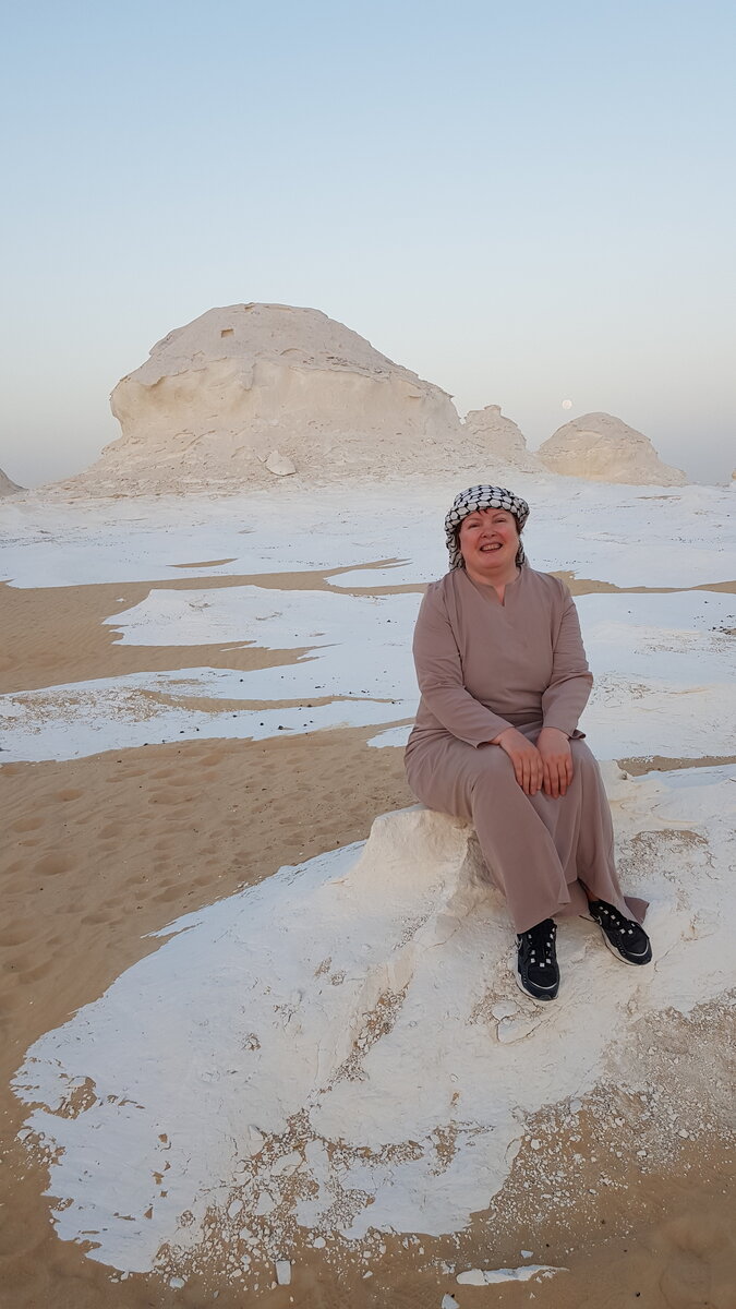 Перед красотой этого места устоять невозможно! Поэтому я надела абайю, которую купила еще в Саудовской Аравии, и решила сделать фотосессию "жена бедуина в пустыне". Арафатку одолжила у гида. Цвет моего платья, которую гид-египтянин назвал галабеей, хорошо гармонировал с цветом песка. А солнце медленно опускалось за горизонт, и белые "скульптуры окрашивались всё более нежным цветом": И скрылся день; клубясь, туманы