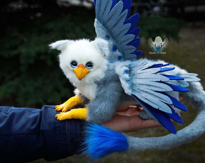 Пушисто-пернатый малыш создан по мотивам грифонов вселенной "Dragon Age". Отличается от привычных глазу грифонов из мифологии лишь перьями у основания хвоста. Милые глазки и поднятые ушки так и просят взять грифончика на ручки. Однако не стоит забывать, что он хищник с мощным клювом и острыми коготками) Полностью подвижен, включая ушки и крылья. В длину 65см, размах крыльев 42см. Длинный хвост хорошо обвивает шею, позволяя грифончику удобно сидеть на плече; ~ Мордочка (опушена мехом) и лапки из полимерной глины, тело сшито из иск. эко меха, крылья из фетра. Пост автора Ajani06. Комментарии к посту на сайте Пикабу.