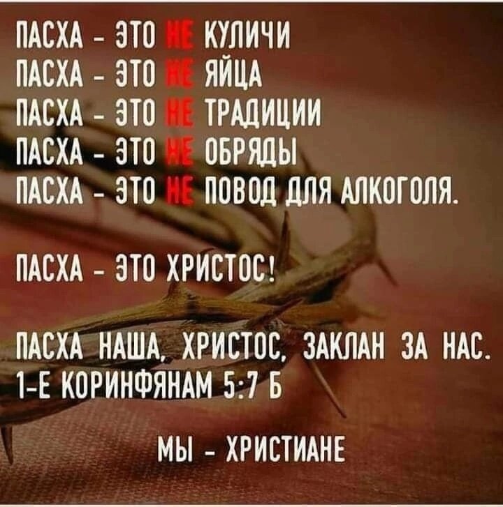 НАША ПАСХА Библия нам повествует, что, когда Бог выводил евреев из Египта (из плена), Он велел им заколоть чистого ягненка без всякого пятна и порока (повреждения) и есть эту жертву и помазать косяки дверей, чтобы ангел-губитель, пришедший губить первенцев египтян, не погубил их. Эта жертва, кровь ее, защищала их и Бог назвал это Пасхой и велел ежегодно ее праздновать - приносить ягненка в жертву и есть. Пасха, жертва, пока ее приносили, защищала евреев от дьявола, от губителей. Когда они отходили от Бога, переставали совершать Пасху, их враг уводил в плен. Когда они каялись и возвращались к истине, Бог возвращал их в землю, данную им, и восстанавливал. А когда пришел Господь, Он стал совершенной жертвой без пятна и порока за всех людей, не только за евреев, но и за нас, чтобы Его кровь всегда нас защищала от дьявола, когда мы верою принимаем Его своим Господом, принимаем Его жертву за нас лично, за наши грехи. Теперь представьте, каковы чувства Отца, отдавшего Сына в жертву за нас,