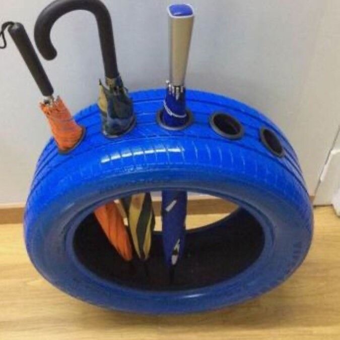 Вот, на даче, можно из шины изготовить вот такую симпатичную подставку для зонтиков, тростей или даже для лопат, граблей. На зиму хранить так удобно ведь.