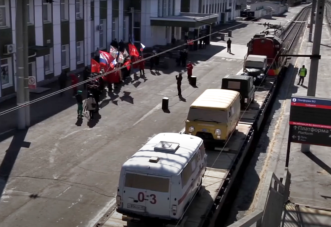 Недавно по Сети разошлись кадры, показанные на федеральном российском телеканале, как из Кургана отправляют советские автомобили повышенной проходимости. Причём делается это всё не в закрытых вагонах-автовозах, или же не в вагонах-сетках, а на открытых вагон-платформах. Так на кадрах отправки были показаны два микроавтобуса УАЗ "Буханка", один УАЗ-469 и один ГАЗ-69. Разумеется всё это проходило в торжественной обстановке с телекамерами, с флагами и священнослужителем. Однако у некоторых возник вопрос: зачем автомобилям закрыли окна фанерой, а также заклеили фары, поворотники и фонари? Неужели при таком вот перемещении на открытых вагон-платформах всё это остекление может разбиться? Странно также и то, что ни у кого не возникли вопросы по поводу возраста этой техники, а также количества. Да и работа священника, который освящает технику святой водой из бутылки, а не из традиционной церковной утвари, тоже никого не смутила. Ну что ж, действительно, РЖД всегда старается перевозить автомоб