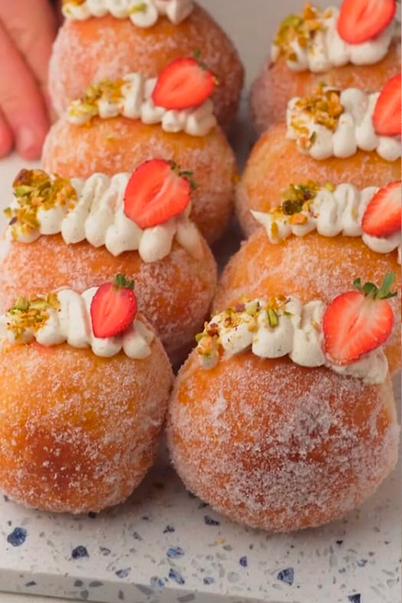 Пончики - это вкусное лакомство, которое можно приготовить дома со своими любимыми ингредиентами. А если добавить к ним клубнику и фисташковый крем, то получится настоящий шедевр в мире десертов. Давайте рассмотрим рецепт клубнично-фисташковых пончиков Ингредиенты: Для теста: Для фисташкового крема: Для клубничного варенья: Для ванильного крема (по желанию): Инструкции: Приготовление пончиков с клубничным вареньем и фисташковым кремом - это вкусный и оригинальный способ порадовать себя и своих близких. Ароматное тесто с нежным фисташковым кремом и сладким клубничным вареньем создают неповторимое сочетание вкусов, которое наверняка понравится всем любителям сладостей. Попробуйте приготовить эти вкусные пончики дома и насладитесь неповторимым вкусом и ароматом!