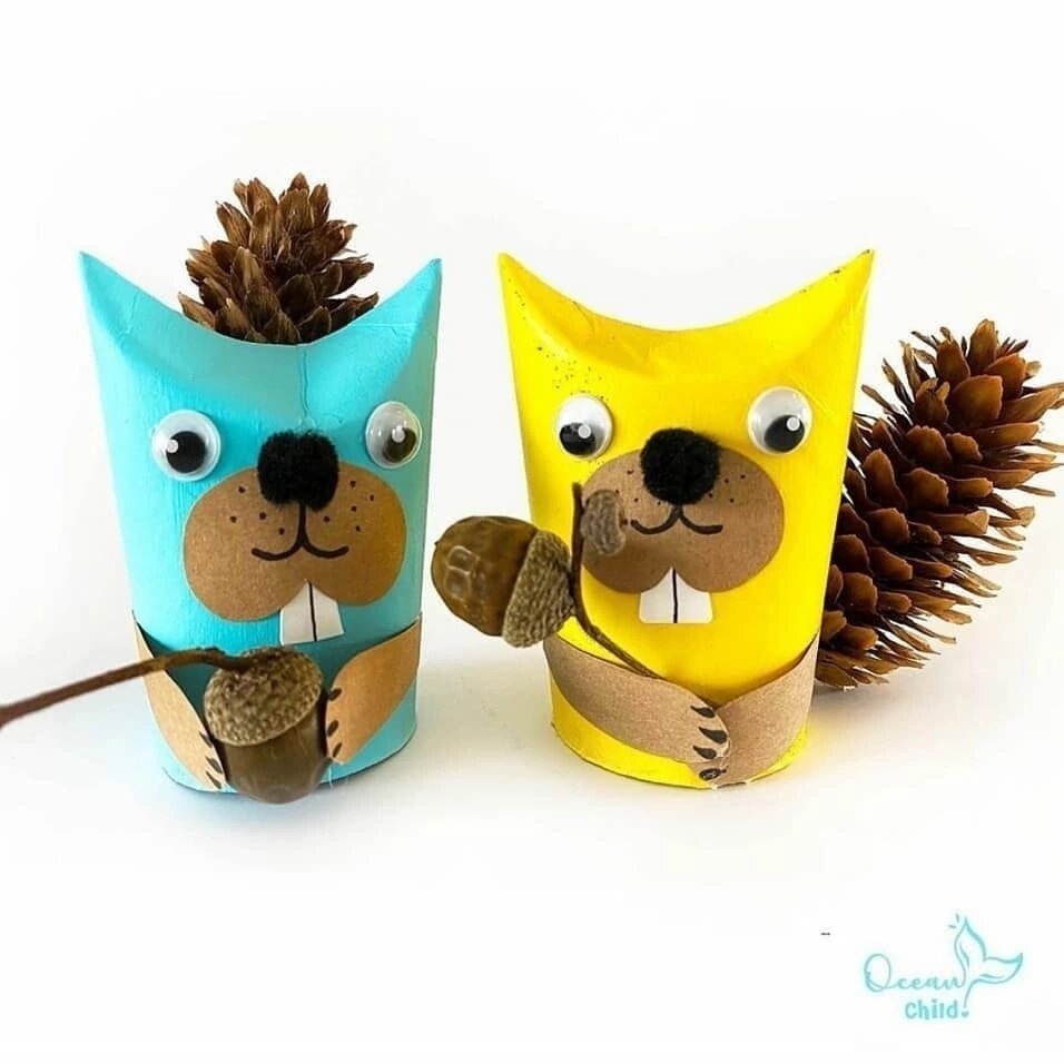 Втулка от туалетной бумаги, цветная бумага, шилки/жëлуди, глазки и нос, клей.