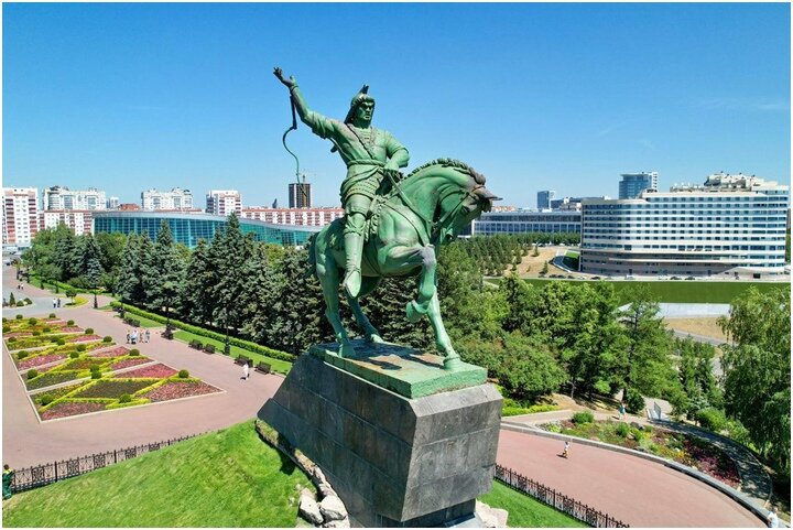Монумент уникален тем, что при весе 40 тонн стоит на трёх опорах. Отливали статую в Ленинграде из сплава бронзы и чугуна. Высота памятника составляет почти 10 метров, вместе с постаментом – 14. Он виден издалека, ещё при подъезде к столице Башкортостана.