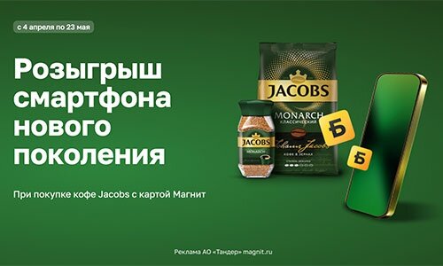 Подробнее https://reklamnyeigry.ru/2023/04/16/%d0%ba%d1%83%d0%bf%d0%b8-jacobs-%d0%b8-%d0%b2%d1%8b%d0%b8%d0%b3%d1%80%d0%b0%d0%b9-%d1%81%d0%bc%d0%b0%d1%80%d1%82%d1%84%d0%be%d0%bd-%d0%bd%d0%be%d0%b2%d0%be%d0%b3%d0%be-%d0%bf%d0%be%d0%ba%d0%be%d0%bb/ Чтобы принять участие в рекламной акции Купи JACOBS и выиграй смартфон нового поколения необходимо с 05 апреля по 23 мая 2023 года: 1. Нажать кнопку “Участвовать” в приложении Магнит; 2. Купить кофе Jacobs, участвующий в акции, с использованием карты покупателя; Покупки из Магнит Доставки не участвуют в акции. Призовой фонд: