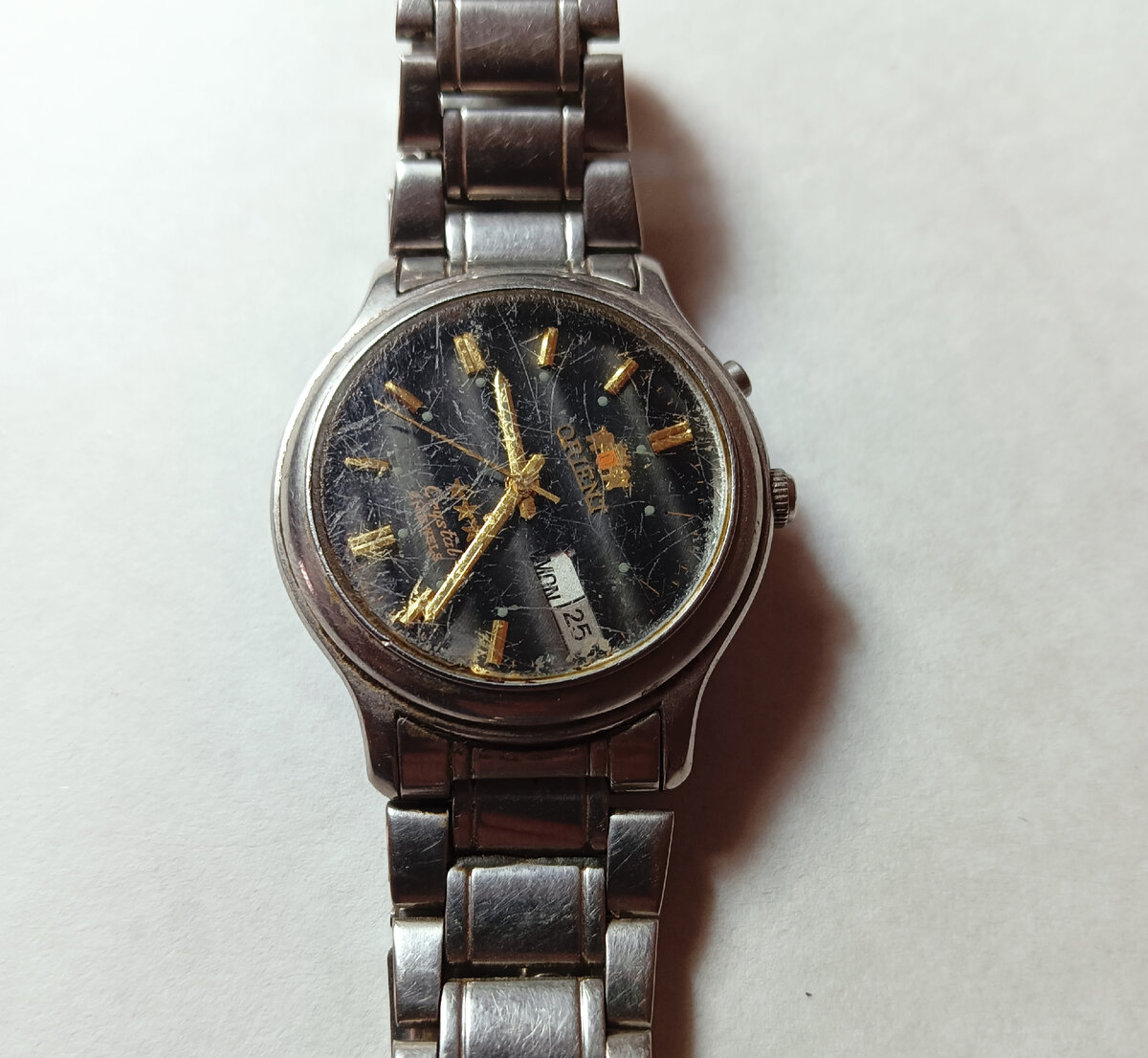 Доброго времени суток! Поступил в ремонт ORIENT - циферблат оторвался. Сами часы, как видно активно используются, на стекле "живого места" нет от царапин. Приступаю. Вообще я с большим уважением отношусь к данному бренду, часы качественные и долговечные.От длительного ношения уже стираются надписи на задней крышке, родной браслет. Но вот с циферблатами прямо напасть - циферблат достаточно тяжёлый, а ножки тонкие и при сильном ударе ножки просто срезает, да и накладки на циферблате часто отваливаются. Открутил крышку - часы на ходу, следов загрязнения и воды не наблюдается. На задней крышке дата последнего ремонта - 29.03.2015. некоторые мастера ставят дату, я уже давно перестал это делать. Маятник буду мыть - слипаются витки на спирали, явно часы сильно спешили. Хотя владелец сказал что ходили отлично пока он их не стукнул. Снял стрелки и циферблат. Извлёк оторванные ножки. На месте ножки просверлил отверстие. Оба отверстия готовы, вместо ножек буду вкручивать винты крепления циферблат