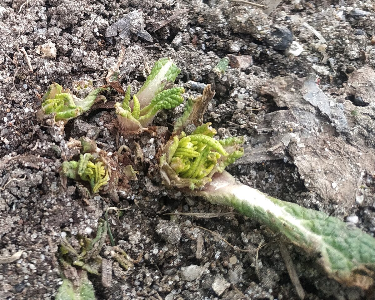 Всех с пасхой! Красивых яичек и вкусных куличей! А у меня сегодня печаль!( Куда не глянь либо обмороженая как камень земля... Либо сухая, как песок в пустыне. Каждый год с северной стороны забора весной там лежит лед!( Но в этом году там не просто был лед, там сейчас все каменное и видно по примулам и другим растишкам как там все плохо!( Оказывается ушковая примула у меня все таки есть. Листья чуть волосистые и серебристые. Но и ей плохо. О другой примуле промолчу... 😞 Там же и геухера однажды погибла, тоже видимо от сильного обморожения земли... Верх растений требует питания, а питаться никак. Муж уверял, что с доенажной трубой и подьемом уровня земли этого жесткого обледенения не будет. Типа вода будет уходить, а значит и льду не из чего сотворяться. Фиг, все тоже самое, еще и хуже. 🤷 Вобщем ничего на расстоянии полуметра сажать туда нельзя. Но я и так планировала в этом году делать отступ от забора, посадить декоративные кусты и мульчировать щепой. А сушь весенняя тоже дело