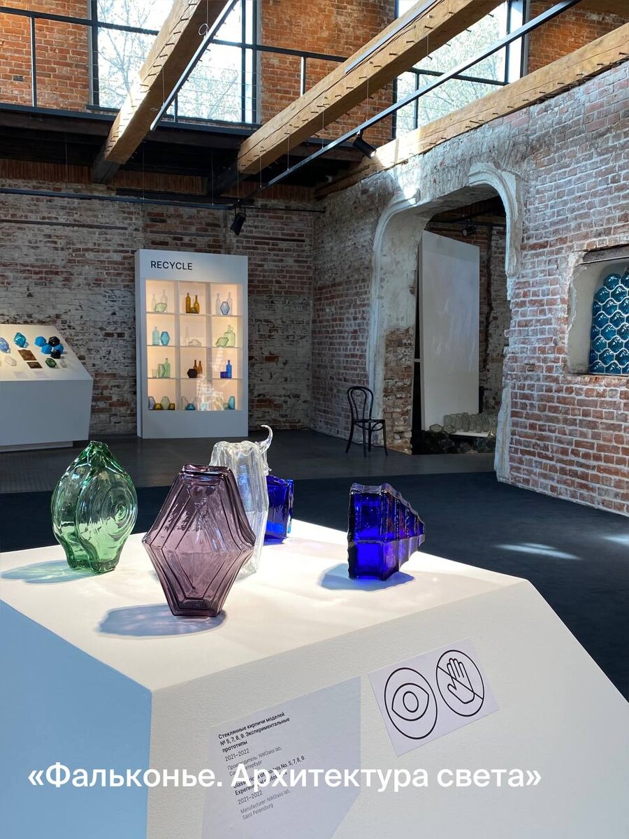 Экспозиция Музея Архитектуры посвящена самому функциональному и эстетичному из стекол — фальконье. О нем рассказывают рекламные листовки, архивные фотографии, чертежи конкурентов и инсталляции из аутентичных и современных моделей.