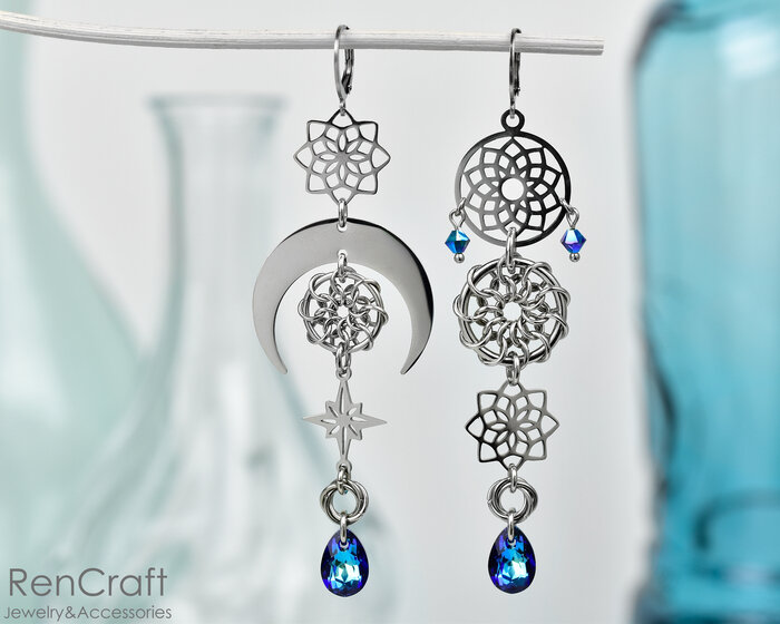 Что ж, прошло три недели, пора постить пост) Для начала парочка вариантов серег под названием "Witchcraft". Эти длинные асимметричные кольчужные серьги выполнены из медицинской стали с австрийскими кристаллами. Эта сталь гипоаллергенна, не вызывает раздражения на коже, не боится воды и не темнеет со временем. Длина этих серег 94мм, ширина 30мм, масса одной серьги 6гр. Очень популярны, кстати, пришлось делать несколько модификаций, так как просто кончались материалы) Серьги "Majestic"с натуральным чистым аметистом: Жаль, что было только два камушка, так что серьги получились эксклюзивные) Новый синий лабрадоритовый кулон: Высота его 18мм, ширина 24мм, толщина 8мм. Масса: 11гр. И, наконец-то сделала приличные фотки замечательного браслета сочетающего сталь и бронзу) Плетение называется "Dragonback". Браслет разный с внешней и внутренней стороны: Ширина его 15 мм, толщина 6 мм, масса 25 гр. Ну а на сегодня это всё! Найти меня можно в ВК и телеграме: Ссылки в профиле. Пост автора RenCraft.