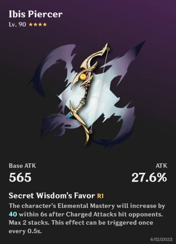 Клюв ибиса — 4★ лук за главное событие 3.7 Характеристики на 90-м уровне: • Базовая атака: 565 • Сила атаки %: 27.6% Пассивка на R1: • Мастерство стихий персонажа увеличивается на 40 ед. на 6 сек. после попадания заряженной атакой по противнику. Эффект складывается до 2 раз и возникает раз в 0.5 сек.