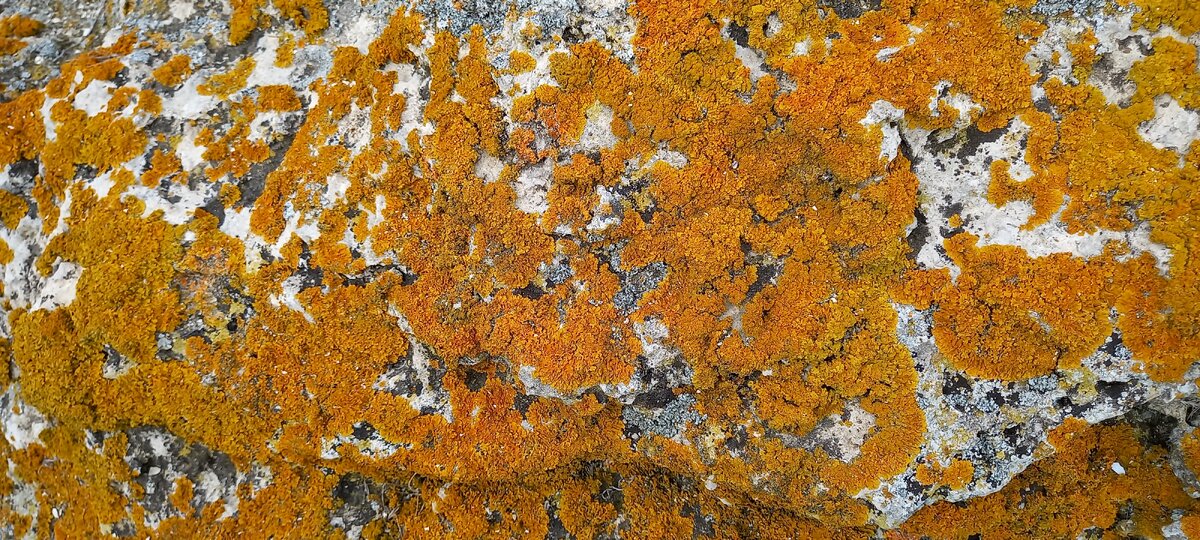 Серые, мрачные камни на высоком берегу Казантипа окрасились в ярко-оранжевый цвет. Это не просто налет, а живой организм. Два в одном - гриб и водоросль объединились в живое существо, называемое лишайником. Благодаря такому симбиозу лишайники наиболее распространены на земле. Они не боятся ни холода, ни ветра, ни мороза, ни жары, ни ветра. Они везде. Те которые растут на камнях, называются накипными лишайниками. Среди них много разновидностей разных цветов В этом году на Казантипе их особенно много. Они разрослись, расцвели озарив пасмурные дни яркими красками. Зима была теплая и влажная - приморские камни получили парчовый наряд, который завораживает. Среди ярко-оранжевого цвета встречаются и другие расцветки. Так о чем молчат лишайники на этих серых, мрачных камнях? О том, что им здесь очень комфортно и местным жителям повезло: они дышат чистым воздухом, насыщенным кислородом. Ученые давно обнаружили, что лишайники являются индикаторами природной среды, они пропадают на заг