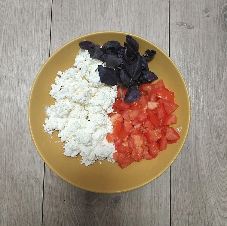 Можно готовить в качестве ужина. После 18-00 всегда так хочется есть. Чем ближе к полуночи, тем аппетит становится сильнее. Не надо ждать срыва — лучше сразу перекусить низкокалорийным, но питательным и полезным блюдом. Вот всё, что необходимо для счастья 😄👆 Вообще, идея такой закуски пришла ко мне случайно. Я хотела перекусить творогом. Но вместо своего сахарозаменителя взяла соль. Что-то менять было поздно, ведь я всё уже перемешала. К слову сказать, соленый творог я тоже очень люблю. Но обычно я к нему добавляю зелень: укроп, кинзу и петрушку. Здесь я решила поэкспериментировать. Итак, что взяла: Ну и просто всё перемешала, предварительно, конечно, порезав помидор с базиликом. Вкус просто потрясающий. С такой закуской можно сделать диетическую брускетту. Попробую в ближайшее время подобрать подходящий рецепт. Ну вот давайте посчитаем по калорийности: Базилик считать не буду. Там просто совсем смешные цифры получатся, которые в расчет можно не брать. Но если кому-то интересно, то