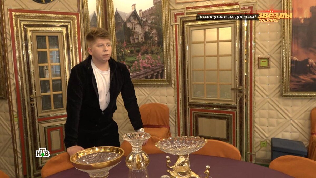 [ Смотреть видео на сайте НТВ ] Помощник Александра Серова был его поклонником, собирал диски и приходил на концерты. В итоге певец нанял юношу на работу и предоставил ему двухэтажный дом на своем участке. В студии шоу «Звезды сошлись» помощник Александра Серова Егор Суриков рассказал, что учился заочно на первом курсе, когда певец предложил ему работу. Юноша согласился. Сейчас он живет в отдельном двухэтажном доме на участке певца, где есть все необходимое. На подоконнике стоят антикварные часы, а на окнах висят шторы с кристаллами. Молодой человек ест из позолоченных тарелок и пьет из хрустальных бокалов. Интерьер в стиле «дворцовый шик» Егора не напрягает, а, наоборот, настраивает на рабочий лад. На втором этаже расположена спальня в бордовых тонах, ведет туда специальный подъемник. Но Серов заранее предупредил, что посторонних в этот дом нельзя приводить. Как отметил Егор, не приглашает он и девушек, встречаясь с ними на нейтральной территории. Но Серов приглашал в гости родителей
