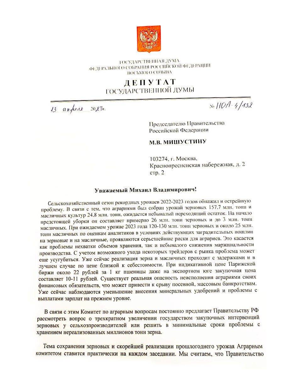 В Госдуме увидели риски неисполнения аграриями финансовых обязательств, что может привести к банкротствам. Поэтому предложили правительству рассмотреть вопрос о трехкратном увеличении закупочных интервенций зерновых или решить в минимальные сроки проблемы с хранением нереализованных миллионов тонн зерна, следует из письма.
