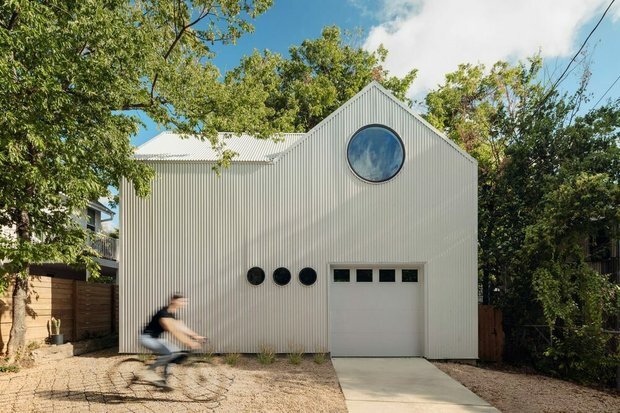 Недавно студия North Arrow завершила строительство удивительного дома с круглым окном — из-за этой особенности постройка напоминает милый скворечник. Компактное здание находится в Техасе — его площадь составляет 84 квадратных метра. Это пристройка к главному жилому дому. Фото: dezeen.com Главный архитектор студии описал работу как «дом с предельной простотой». Она ощущается во всем — от палитры материалов до масштабов. При этом студии удалось спроектировать уютное и продуманное жилье, которое вызывает улыбку. Сооружение стратегически расположили посреди деревьев, чтобы создать внутренний двор между главным домом и пристройкой. Фото: dezeen.com Планировка L-образная: включает спальню, ванную, кухню и гостиную с раздвижными воротами на первом этаже. Наверху находится мастер-спальня под сводчатым потолком: окна здесь намеренно сделали похожими на дырку в скворечнике, чтобы привнести в дизайн оригинальность и причудливость. Фото: dezeen.com Смотреть целиком: Как скворечник: компактный и ую