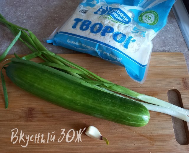 Я же предлагаю заменить сахар на соль, а фрукты на огурцы. Приготовим низкокалорийный, богатый белком салат из творога, огурцов и зелени.