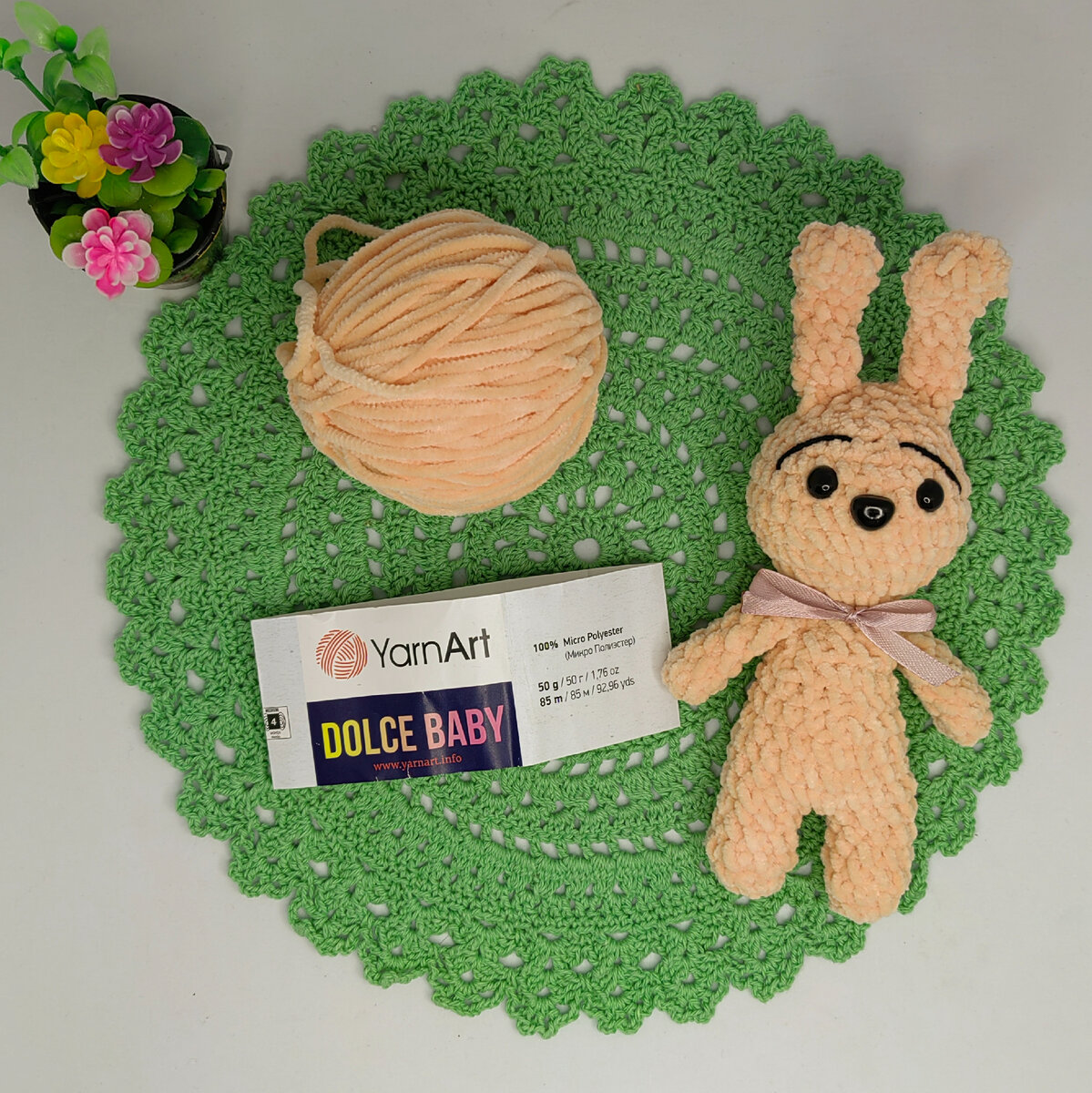 Про то, как я люблю плюшевую пряжу, вы уже знаете. Тестирую еще одну: "YarnArt Dolce Baby". Ее мне подарили в обмене подарками к 8 Марта, но руки "дошли" только сейчас. Не стала изобретать что-то новое, а связала из нее зайку по своему МК "Зайчики в карманчике", который выпускала к Новому году. В составе ниточки 100 % микрополиэстер, выпускается моточками по 50 грамм, длина нити в мотке 85 м. Производитель рекомендует спицы 4,5 мм и крючок 5 мм. С моей плотностью вязания для игрушки я всегда беру меньше заявленного, поэтому зайчика вязала крючком №2 фирмы "Пони". Ниточка тактильно приятная - нежная, мягкая, плюшевая. При плотном вязании иногда чуть поскрипывает, но это не страшно. Единственная неприятная особенность как и у "старшей сестры" "Дольче" - кончик осыпается, а распускать ошибочно провязанные петли нужно крайне осророжно, так как нить повреждается и теряет пушинки. Поэтому новичкам в вязании эту ниточку рекомендую с осторожностью, чтобы не пришлось жалеть о потраченном вре
