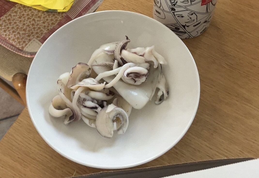 Вместо кальмаров у нас была сепия (каракатица), которую Симоне ещё неделю назад купил на рынке Риалто и заморозил. Накануне сварил и почистил. По вкусу с кальмаром разница совсем небольшая, но вот чистить гораздо сложнее.
