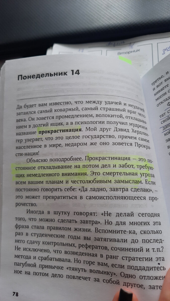Здравствуйте мои хорошие 🌼 Возвращаемся к мотивации по изменению своей жизни 💪 Где же понедельники 8-13 ??? Они были между дел. Была прокрастинация (о которой говорится в этой главе), выгорание и просто жизнь. Но!!! Двигаемся дальше. Основная цель моего главного проекта получить диплом бизнес-коуча. Стать консультантом. Вести сессии и мотивировать вас дальше на создание своей жизни мечты без стереотипов и навязанных мнений. Задание этой недели - победить прокрастинацию. Не откладывать на потом дела 💪 Если вы со мной давно, то знаете, что я люблю планирование. Если пропустили, то смотрите видео о моем ежедневнике Дорогие мои, на этой неделе я должна написать практическую работу по консультации с клиентом, разложить метафорические карты, нарисовать колесо баланса и поставить цели на месяц. Все это должно войти в мою практическую. Подскажите кто-то из вас хочет это сделать со мной индивидуально в телеграм? Если да, напишите в комментарии, мы с вами спишемся в ТГ ❤️❤️❤️ Всем
