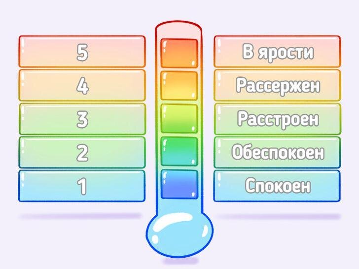Термометр гнева - это визуальный инструмент, который помогает людям отслеживать уровень своего гнева и выявлять триггеры, которые могут вызвать у них гнев. Термометр разделен на несколько уровней, от низкого до высокого, причем каждый уровень отражает различные уровни интенсивности гнева. Чтобы использовать термометр гнева, люди начинают с определения своего базового уровня гнева, который является уровнем гнева, который они обычно испытывают ежедневно. Затем они определяют триггеры, которые могут вызвать у них гнев, такие как застревание в пробке, критика или чувство подавленности. Когда люди сталкиваются с этими триггерами, они могут использовать термометр гнева для отслеживания своей эмоциональной реакции. Например, если они чувствуют легкое раздражение, они могут установить термометр на низкий уровень. Ключевое преимущество термометра гнева заключается в том, что он помогает людям лучше осознавать свои эмоциональные реакции и предоставляет им конкретный инструмент, помогающий регули