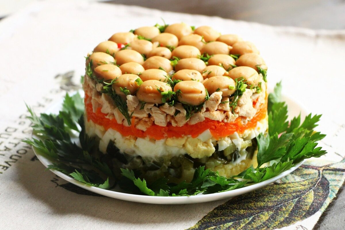 Солите слои по своему вкусу. Верх салата выложите грибочками и украсьте зеленью.