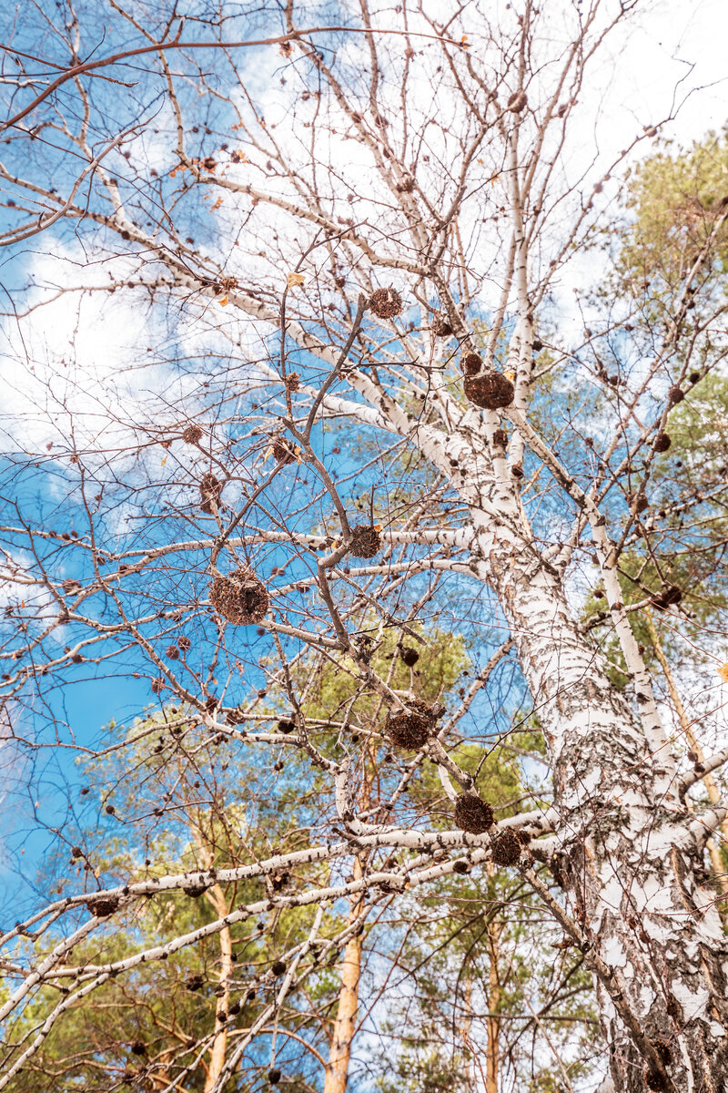 Ведьмина метла (лат. Taphrina betulina ). Необычные наросты на берёзовых ветвях.