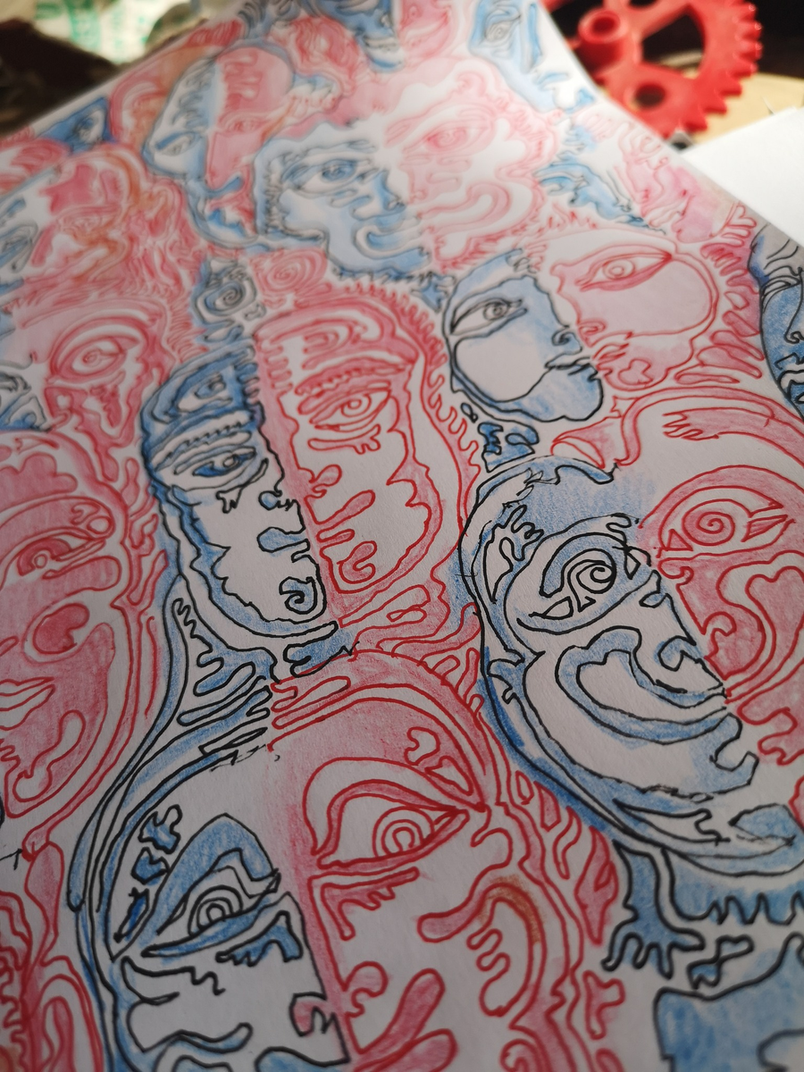 Зыбкое искусство. Это чёрные бархатные штаны, и вот он сидит, положив ногу на ногу и рисует на этих самых «штанах». Перекладывая ворс, с одной стороны на другую, палочкой от мороженного. Получается, красивые портреты, а потом он просто встряхивается, и портреты пропадают.
