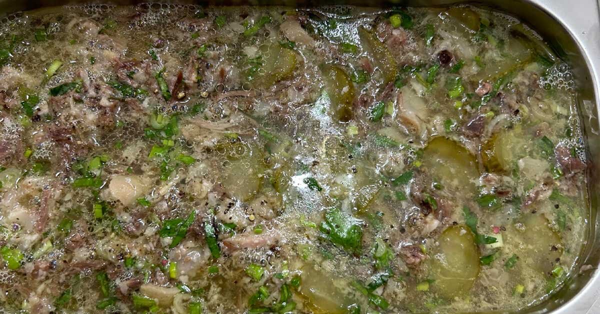 Каждая хозяйка добавляет в холодец что-то свое, я вот не представляю его без соленых огурцов