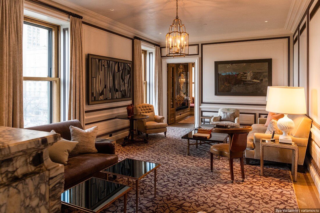 Итак, квартира расположена в отеле "Плаза". "Плаза" – один из самых известных и пафосных отелей Америки и всего мира. Цены на номера здесь начинаются с $500 и доходят до $30-40 тысяч за ночь. Здание отеля было построено 111 лет назад – немного позже, чем Флэтайрон-билдинг, и немного раньше, чем Вулворт-билдинг. То есть это один из самых старых и узнаваемых символов Нью-Йорка. Этому способствовало и крайне удачное расположение на 59-й улице, у южного угла Центрального парка, который в начале XX века уже вовсю развивался как главное общественное пространство города.