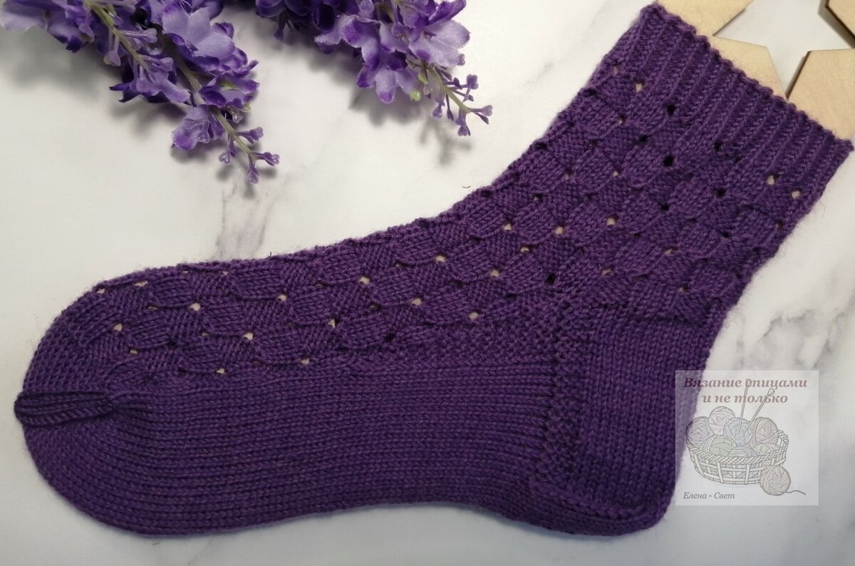 Добрый день, друзья! Предлагаю вам новую модель женских носочков. Носочки связаны из всеми любимой пряжи на размер 37-38 на спицах 2,5 мм. Пряжа Alise Superwash Artisan Метраж 420 м на 100 г Состав 75% шерсть, 25% полиамид Цвет 44 Описание узора Носочки связаны очень простым универсальным узором, справиться может даже начинающая мастерица. Узор подойдет как для мужских, так и для женских носочков. Схему составила в программе Вязаный РФ Петли обозначены так, как они выглядят с лицевой стороны. Будьте внимательны при обратно-поворотном вязании Раппорт узора 8 петель и 12 рядов. Описание узора для кругового и обратно-поворотного вязания 1 ряд: 4 лицевые петли, накид 2 петли вместе изнаночной, 2 петли вместе изнаночной, накид 2, 3, 4, 5, 6 ряды: 4 лицевые, 4 изнаночные 7 ряд: накид, 2 петли вместе изнаночной, 2 петли вместе изнаночной, накид, 4 петли лицевыми 8, 9, 10, 11, 12 ряды: 4 изнаночные, 4 лицевые Описание носочков На спицы 2,5 мм набрала 64 петли для размера 36-38. Для паголенка