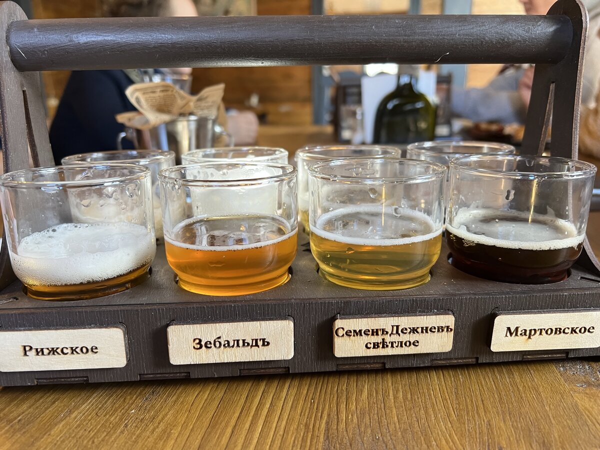 Начну сразу с дегустации. Набор из 7 сортов пива (по 100 мл) и одного стакана воды (освежить рецепторы) стоит 350 рублей. Сырные палочки - еще 320.