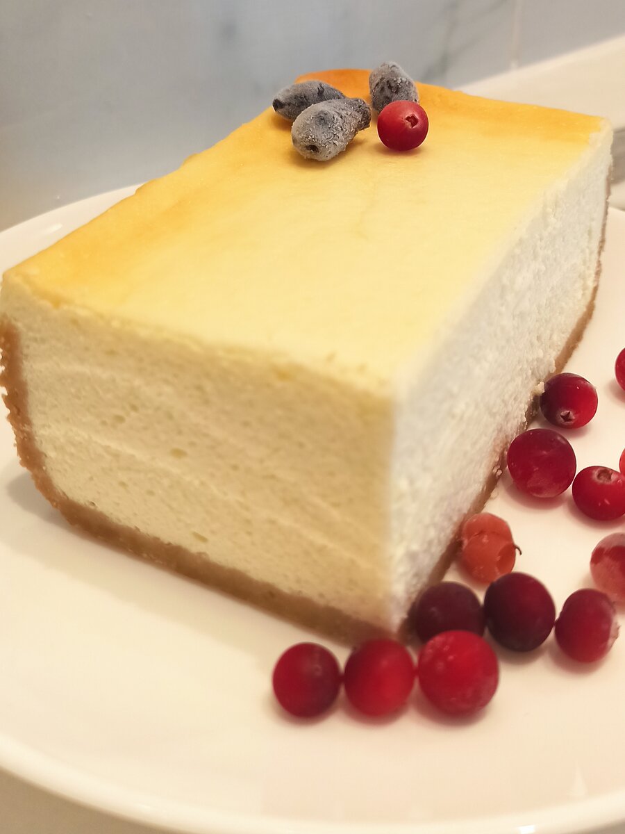 Я обожаю творожные десерты: глазированные сырки, запеканки, сырники, за количество белка в составе и их воздушную структуру. Этот #чизкейк получается даже лучше, чем в ресторане. А вкус даже трудно описать словами, Вам обязательно нужно попробовать 🥰 Что же понадобится для десерта? Продукты (на 4 порции): Печенье песочное - 120 г Сахар - 120 г Масло сливочное - 60 г Сыр творожный - 400 г Сметана 20% - 200 г Сливки 20% - 150 мл Яйца - 2 шт. Крахмал кукурузный - 2 ст.ложки Ваниль-1 ч. ложка (или ванильный сахар) Лимон (сок лимона) - 1/4 шт Рецепт: 🟡 Размять 120гр печенья до однородной массы. Удобно воспользоваться блендером. Добавить 60гр растопленного сливочного масла и перемешать до однородного состояния. На дно формы для выпекания (у меня стеклянная форма размера 27 на 17см) разместить кулинарную бумагу (у меня силиконизированная), в форму выложить получившееся песочное тесто, распределить его равномерно, прижимая к дну. Если у вас разъемная форма, то пищевой фольгой об