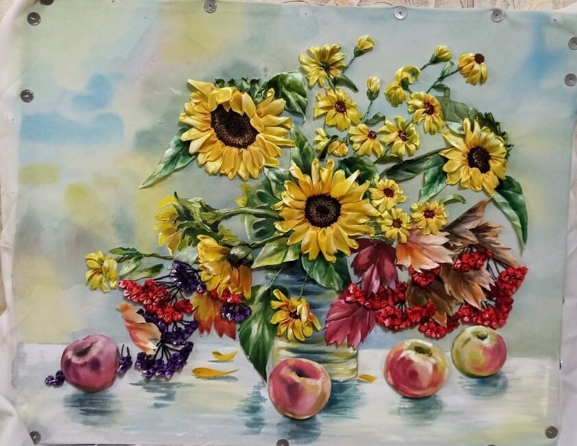 ⚡Закончила вышивку с подсолнухами и яблоками.⚡ 🤩Картина мне очень нравится, НО яблоки сделаны объёмными и как я буду всю эту конструкцию помещать в рамку пока не знаю. Скорее всего придётся🤔 прибегать к помощи саморезиков хотя мне этого и не хочется, но длины металлических пластинок в рамке для закрепления задней стенки явно не хватит. Рамку заказчик просил сделать дорогую, так что надо сначала ехать в соседний город чтобы её купить. Потом уже и буду решать эту проблему🤗