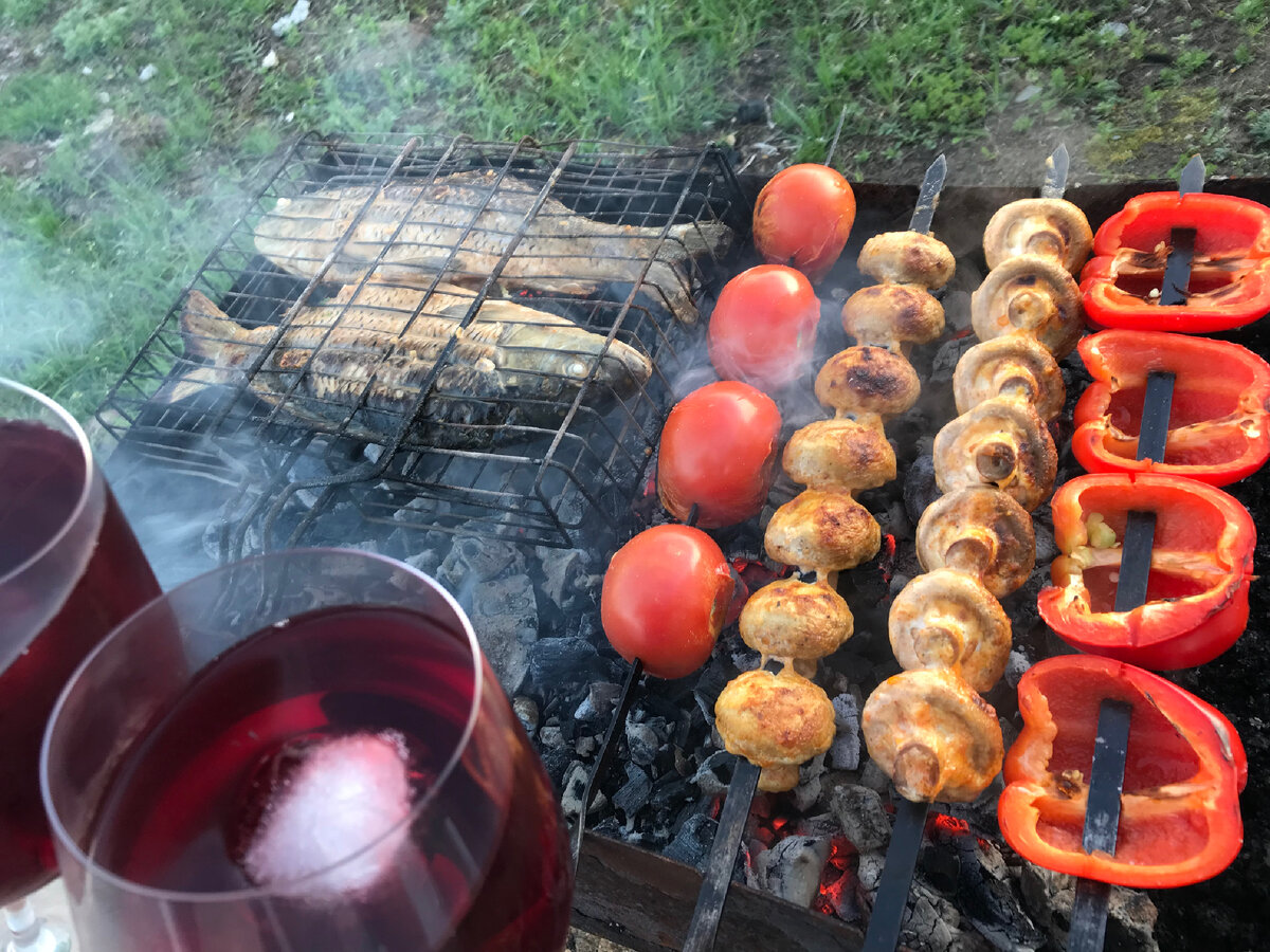 Цена вопроса: 650 рублей Карп: 350 рублей; Шампиньоны: 100 рублей; Помидоры: 100 рублей; Болгарский перец: 100 рублей. Для карпа есть восхитительный маринад, который очень классно сочетается с рыбой. Берём соевый соус, майонез, чеснок и дополнительно соли по вкусу, рыба все таки много берет в себя соли. Все это смешиваем смазываем с обеих сторон, обильно заполняем брюшко. Туда же укладываем именно КИНЗУ и дольки лимона, оставляем помариноваться и на мангал. В процессе жарки смазываем оставшимся соусом. Обязательно рекомендую данный маринад для рыбы. Грибочки мариную с майонезом, растительным маслом, паприкой, солью и приправой (я использую Vegeta). А далее все это вместе на мангал и вуаля, вкусный ужина готов!