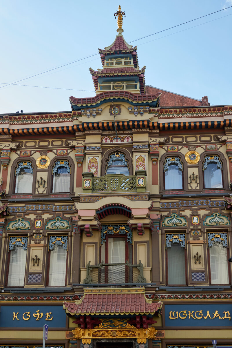 Первое время здание выглядело обычно, оно было построено в стиле позднего ренессанса. В китайском стиле его перестроили в 1895 году к приезду китайского посла Ли Хунчжана, визит которого ожидался на коронацию Николая II. Сергей Перлов надеялся таким образом привлечь внимание одного из самых влиятельных чиновников Китайской империи, чтобы заключить особые контракты на поставку чая.