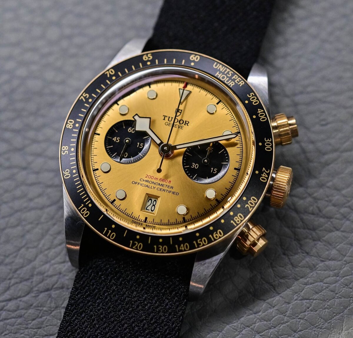 В зависимости от Ваших предпочтений, Tudor предлагают эту модель в трёх вариантах дополнения. На выбор - монотонный чёрный ремешок из жаккардовой ткани, харизматичный (но не в моём вкусе) кожаный ремешок в стиле Bund, а также, если Вы готовы доплатить, органичный классический трёхзвенный браслет выполненный в биметалле. Сочетаясь с акцентами корпуса, центральные звенья браслета выполнены в золоте.