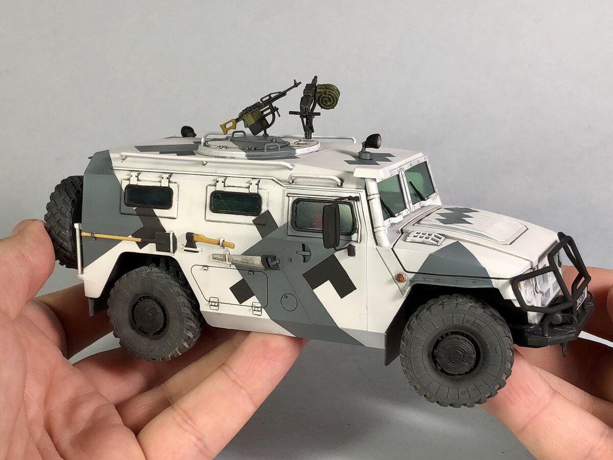 Здравствуйте, друзья! Так как Тигр является одной из моей любимой военной техники Российской армии я сразу решил, что хочу собрать все его модификации, которые выпускает Звезда. И дабы они все отличались на полке, так же решил все их сделать в разных камуфляжах. Первой модели достался арктический камуфляж. При сборке набор дополнил небольшим количеством наружного фототравления от Микродизайн, а также установил смоляные колеса (не помню какая фирма), которые здорово меняют внешний вид машины. Окрашивал Тамией и Аммо Мигом. Везеринг практически отсутствует. В качестве тонировки использовал черную смывку и немного пигмента на колесах. Всем приятного просмотра!