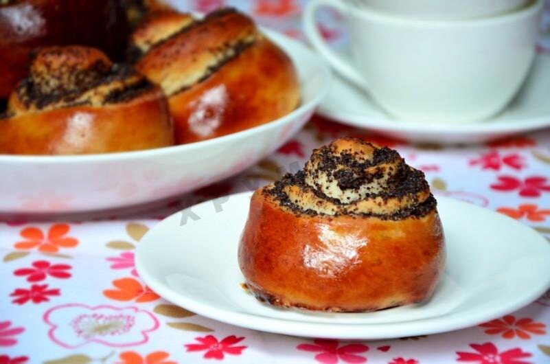 Ингредиенты: - 500 гр. муки - 1 стакан молока - 100 гр. сахара - 100 гр. масла - 2 яйца - 20 гр. дрожжей - 1/2 ч.л. соли - 100 гр. мака Приготовление: 1. Разогрейте молоко до тёплого состояния и растворите в нём дрожжи. 2. В большую миску просейте муку, добавьте соль и сахар. 3. Влейте в миску раствор дрожжей и молоко, добавьте яйца и масло. 4. Замесите тесто до однородности, при необходимости добавляйте муку. 5. Поставьте тесто на подход в тёплое место на 1 час. 6. После подхода тесто выложите на стол и разделите на равные части. 7. Каждую часть раскатайте в пласт и посыпьте сверху маком. 8. Сверните пласт в рулет и разрежьте на кусочки. 9. Выложите кусочки на противень, смазанный маслом, и поставьте в духовку на 30 минут при 180 градусах. 10. Готовые плюшки посыпьте сахарной пудрой и подавайте к столу.