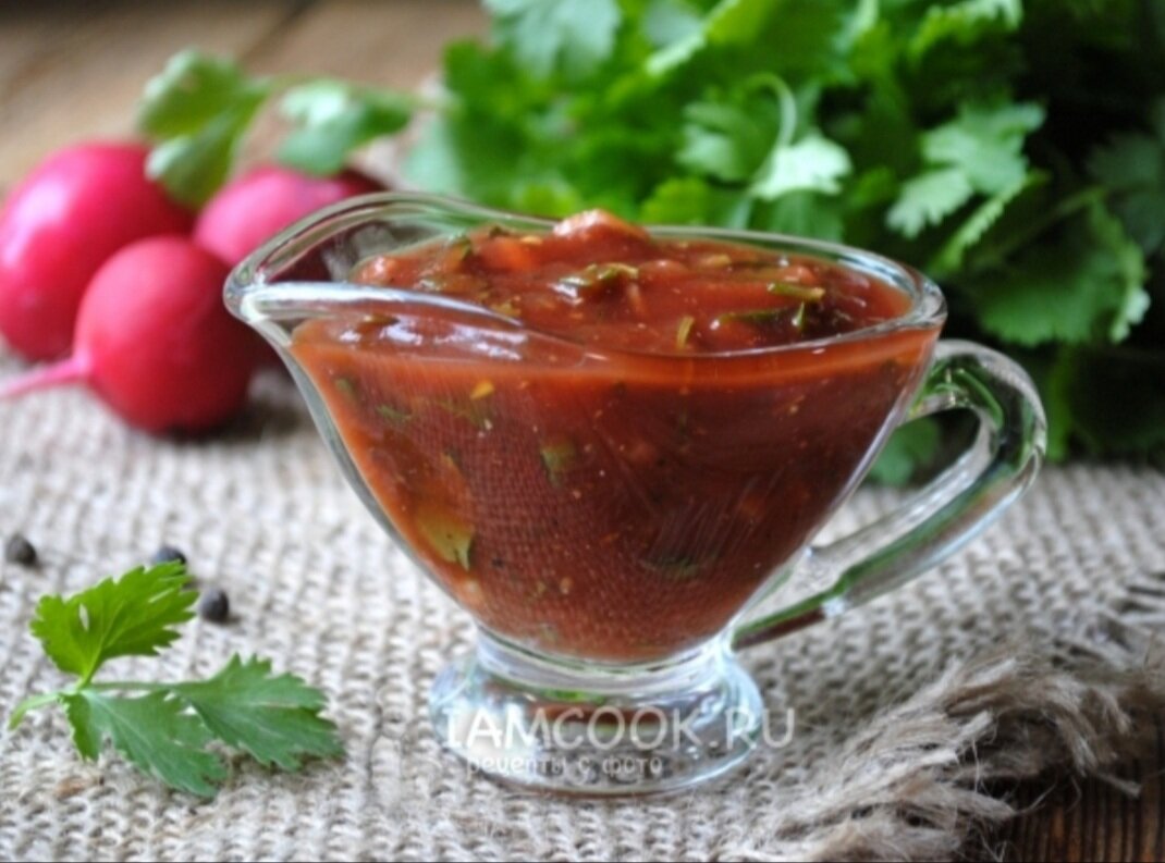 Многие из нас любят вкусненько поесть, не правда ли? Однако зачастую к блюду не хватает подходящего, вкусного соуса. Сегодня речь пойдёт о томатном соусе. Помимо шашлыка этот соус хорошо сочетается с блюдами из мяса, а также с пастой или спагетти. Ингредиенты для его приготовления доступны абсолютно каждому, а способ приготовления прост и понятен. Для приготовления томатного соуса нам понадобятся: Приготовление: - Листья базилика снимаем с веточек, сворачиваем и мелко нарезаем. - Очищаем чеснок и так же мелко нарезаем - Ставим сковороду на огонь. Открываем банку с томатной пастой и выкладываем её (пасту) в сковороду. - Слегка обжариваем пасту на сильном огне, все время помешивая. Это делаем для того, чтобы у соуса был более яркий цвет, и он получил более насыщенный томатный вкус. - Добавляем воду и перемешиваем, что бы содержимое сковороды довести до однородного состояния. - Когда смесь начнёт закипать, добавляем в неё чеснок, базилик, хмели-сунели, сахар, соль и свежемолотый перец.