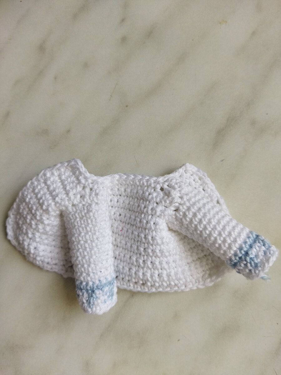 Блузка. 1) 36 вп, по ней 35 ст.(35) 2-11) 10 рядов по 35 ст(35) 12) 6 ст, 8 вп-5 ст пропускаем, 13 ст, 8 вп-5 ст пропускаем, 6 ст(это рукава) 13) 4 ст, 2 уб, 4 ст, 2 уб, 9 ст, 2 уб, 4 ст, 2 уб, 4 ст(33) 14) 3 ст, 2 уб, 2 ст, 2 уб, 7 ст, 2 уб, 2 ст, 2 уб, 3 ст(25) 15) 2 ст, 4 уб, 5 ст, 4 уб, 2 ст(13), вп Обвязываем верх столбиками, сбоку 16 ст, по низу 35 ст, сбоку 3 ст, 2 вп(петля для пуговицы)-2 ст пропустить, 3 ст, 2 вп-2 ст пропустить, 3 ст, 2 вп-2 ст пропустить, 1 ст. Нить закрепляем обрезаем, прячем. РУКАВА. 1) 5 ст снизу, 1 ст сбоку, 8 ст сверху, 1 ст сбоку(15) 2-10) 9 рядов по 15 ст(15)меняем на голубую пряжу, белую не обрезаем. 11) 15 ст голубым(15) 12-13)1 ст голубым, 2 ст белым-5 раз. Голубую отрезаем. 14) 15 ст белым. Нить обрезаем. Второй рукав вяжем также. Туфельки. Я вязала из пряжи сосо. Пришлось вязать в две нити, так как в одну нить туфельки маловаты. Но, если вы вяжете из детской новинки, то можно и в одну нить, только крючок на размер побольше. 1) чёрная пряжа. На