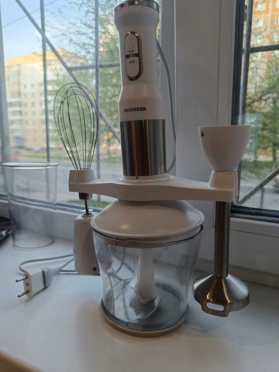 У бледера удобная подставка, удобно хранить комплектующие Есть функция блендера, венчика и погружного блендера Две кнопки: обычная работа и турбо режим. Работает отлично 👍